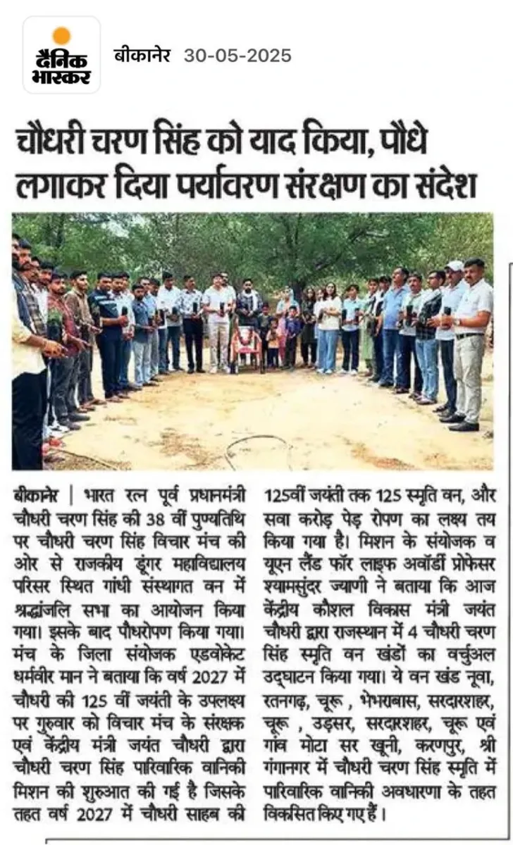 👉 Planted 150 saplings at various locations of Bikaner, Churu and Shri Ganganagar districts as a green tribute to Chaudhary Charan singh
