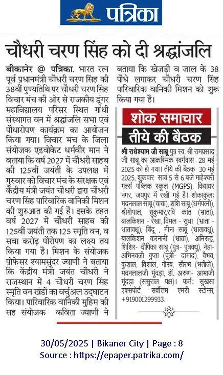 With the launch of the Chaudhary Charan Singh Familial Forestry Mission on 29th May 2025—marking Chaudhary Sahib’s death anniversary—we have resolved to count as many plantations as possible under this initiative.